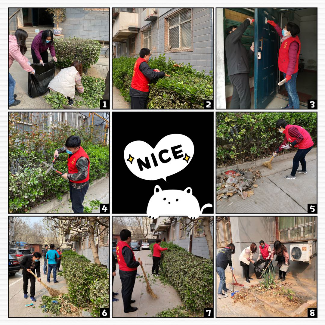 上午9点,志愿者们到达小区后,主动配合门口执勤人员测量体温,做好信息登记。随后立即开始卫生清理工作,对小区路面、楼道、车棚、小广告及绿化带旁的枯枝落叶、白色垃圾、纸屑烟头等进行了全面清理,大家不怕脏不怕累,不放过任何的死角、碎屑,劳动现场热火朝天。在了解到院内部分树木、冬青因为生长茂盛严重影响居民采光这一情况,志愿者主动借来工具帮忙修剪,并将修剪下来的枝杈、叶子等进行了集中清理,消除安全隐患。最后,对楼道及垃圾桶周围进行了消毒。经过两个多小时的辛勤劳动,小区环境焕然一新,志愿者们的无私奉献精神,获得了居民的一致好评。