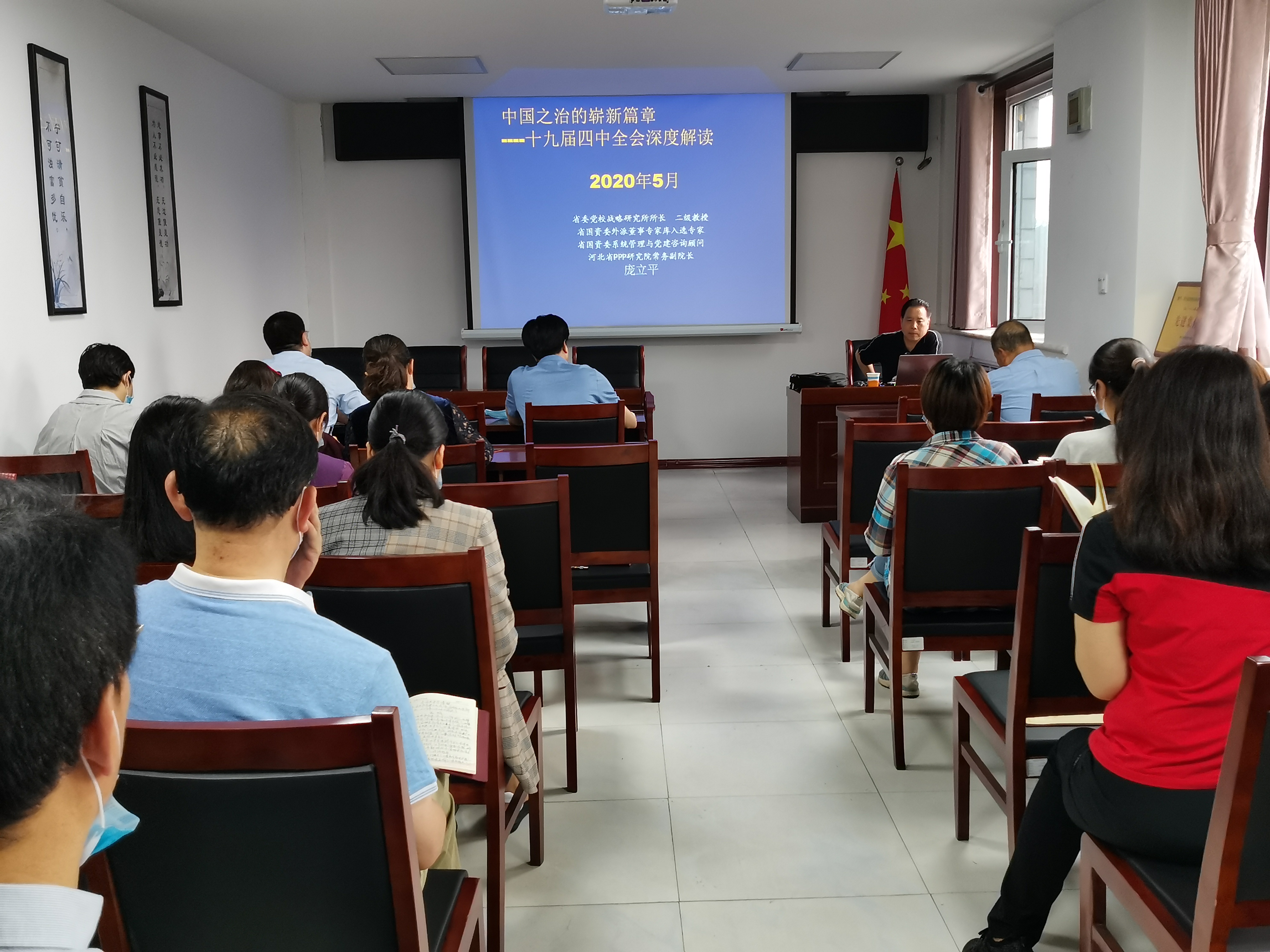 党的十九届四中全会,从党和国家事业发展的全局和长远出发,重点研究了坚持和完善支撑中国特色社会主义的根本制度、基本制度、重要制度,系统部署了推进国家治理体系和治理能力现代化需要重点完善,以重大体质机制改革和需要推进的重点工作任务,深刻回答了“坚持和巩固什么,完善和发展什么”这个重大政治问题。为进一步解读全会精神,5月21日下午,公司聘请石家庄助翔企业管理咨询有限公司的庞立平老师,在六楼会议室为全体党员职工进行了一场以“十九届四中全会深度解读”为主题的培训讲座。